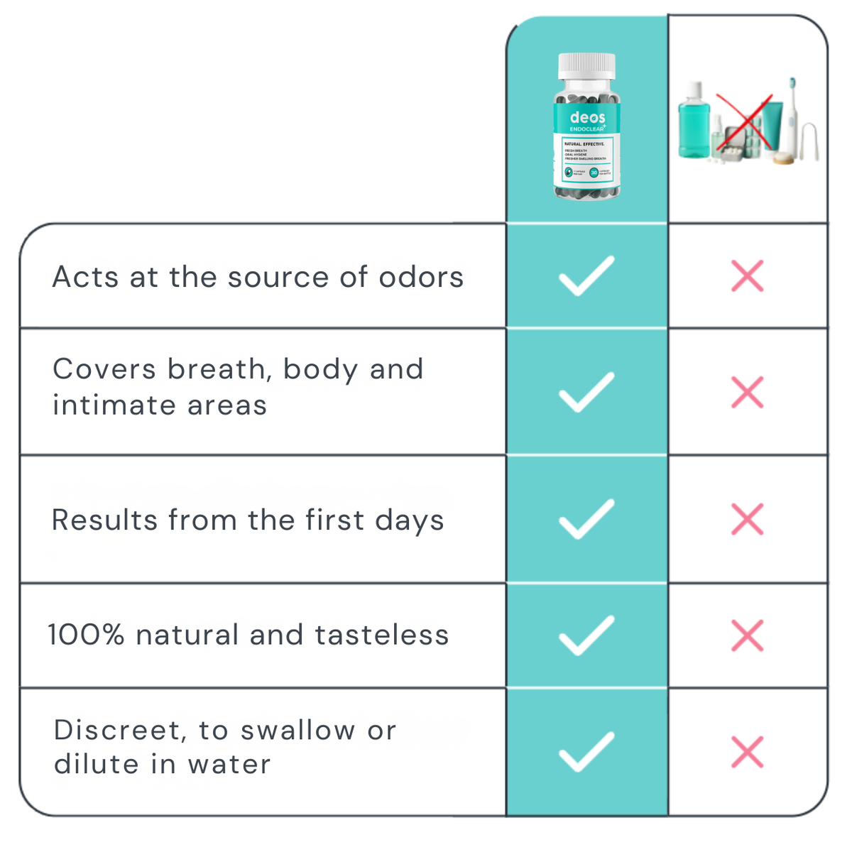 Thanks to its active ingredients, it acts directly in the gut. By rebalancing the microbiota, it limits the proliferation of bad bacteria and neutralizes the sulfur compounds responsible for odors. Result: a natural, long-lasting, and effortless freshness that restores confidence daily.